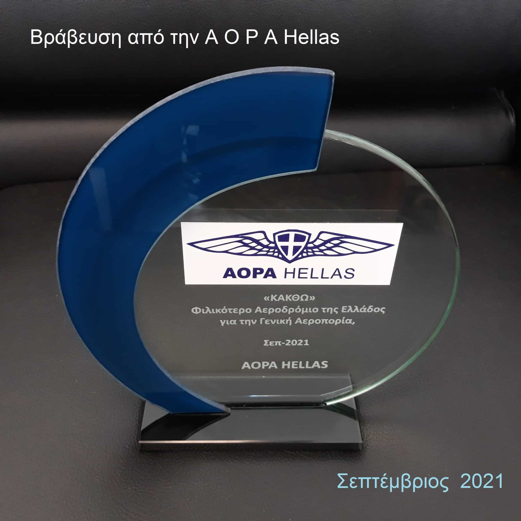 Ο Κρατικός Αερολιμένας Κυθήρων την 2α Σεπτεμβρίου 2021 τιμήθηκε από την ΑΟΡΑ Hellas με ειδική κρυστάλλινη πλακέτα, ως το φιλικότερο αεροδρόμιο της Ελλάδος για την Γενική Αεροπορία (Γ. Α.). Αυτό προϋποθέτει, φιλικότατη αντιμετώπιση των πληρωμάτων αεροσκαφών Γ. Α. επί σειρά ετών, από το προσωπικό, τόσο της Υ.Π.Α. του Κρατικού Αερολιμένα Κυθήρων, όσο και του φορέα επίγειας εξυπηρέτησης α/φων Skyserv, καθώς και βελτίωση υποδομών για την Γ. Α., όπως εγκατάσταση δεστρών για ελαφρά και υπερελαφρά αεροσκάφη στις θέσεις στάθμευσης Γ. Α. ή την δρομολογημένη δημιουργία «πάρκου καυσίμων», για την εξυπηρέτηση των αεροσκαφών Γ. Α. με αεροπορικό καύσιμο AVGAS (100 LL). Αυτό σημαίνει ότι τα Κύθηρα γίνονται, ελκυστικότερος προορισμός για αεροσκάφη αεροπορικού τουρισμού (Γ. Α.).