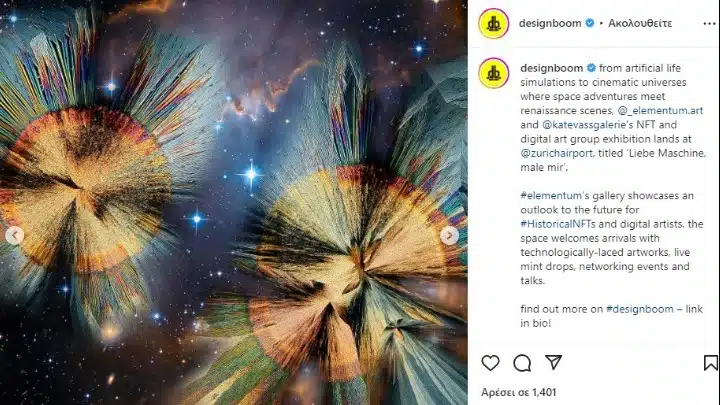 Συνεργάστηκαν η elementum.art NFT Gallery και η Kate Vass Gallery και στον τερματικό σταθμό επιβατών Circle 18 του Αεροδρομίου της Ζυρίχης καλούν έως τις 24 Δεκεμβρίου τους επισκέπτες σε μια εμβυθιστική εμπειρία ψηφιακής τέχνης.