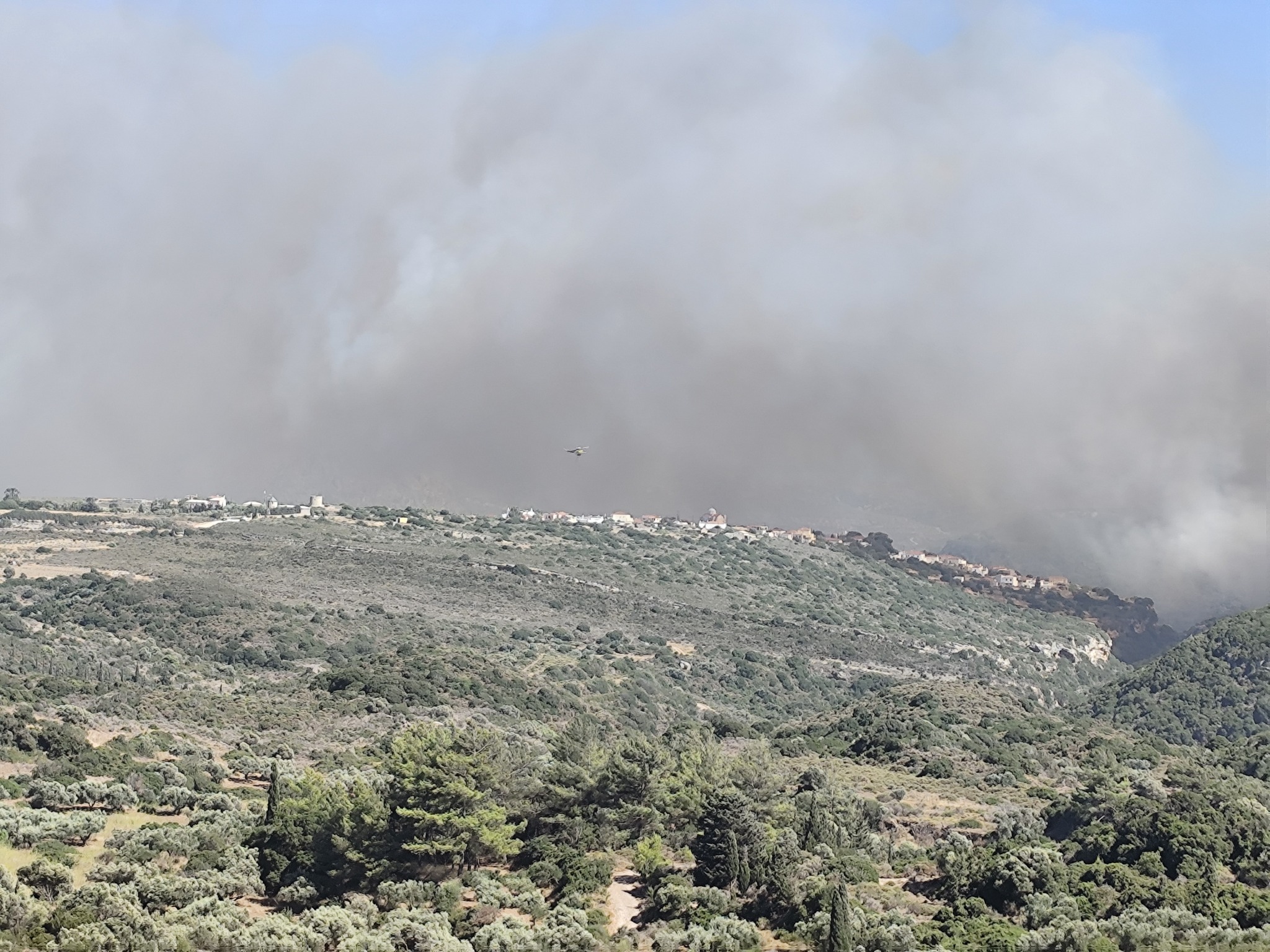 6:27 – Η πυρκαγιά έχει κόψει ουσιαστικά το νησί στα δύο. Η φωτιά, κινούμενη με ορμή από τα δυτικά προς τα ανατολικά, έχει αποκόψει τη βασική οδική σύνδεση προς το νότιο τμήμα των Κυθήρων.