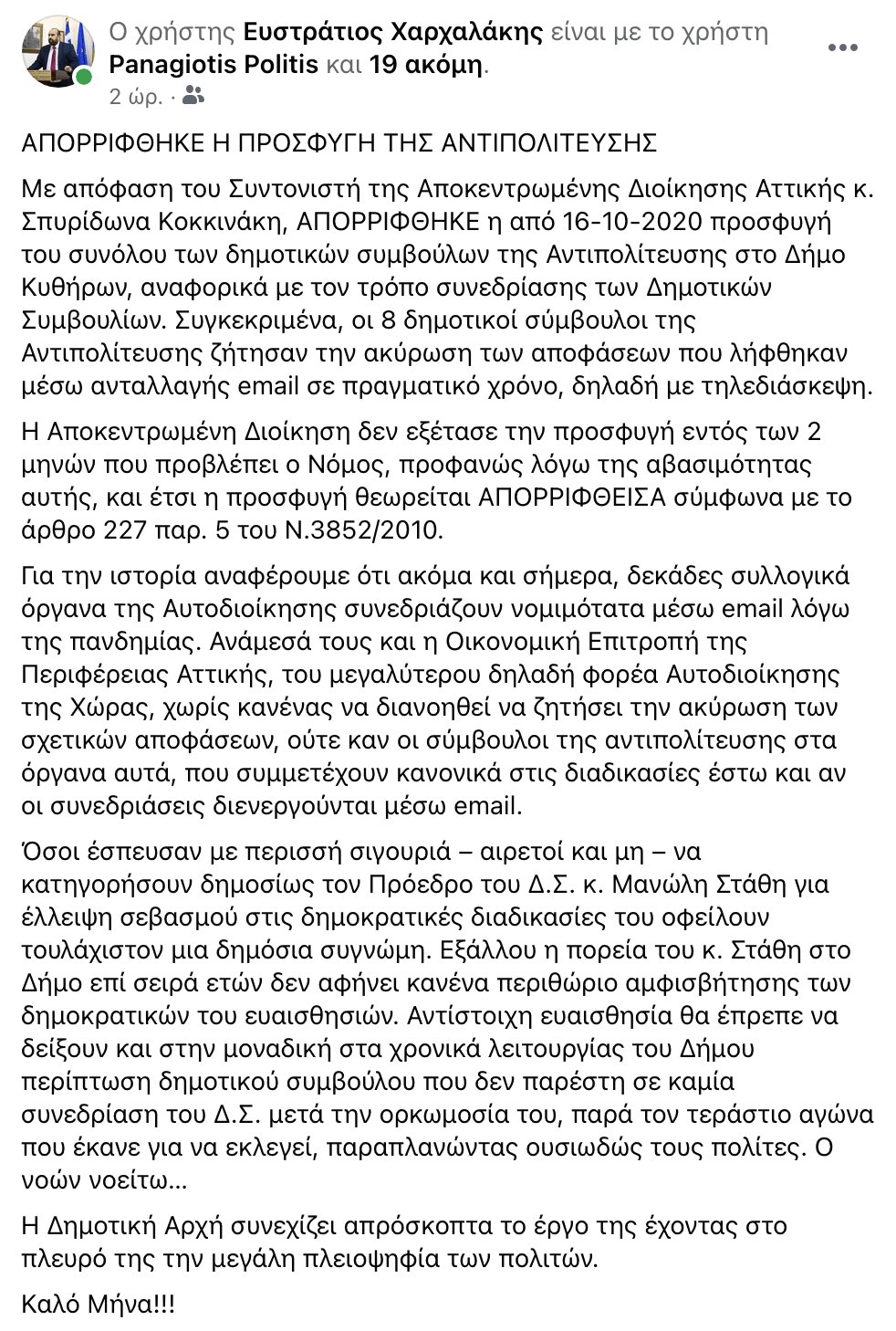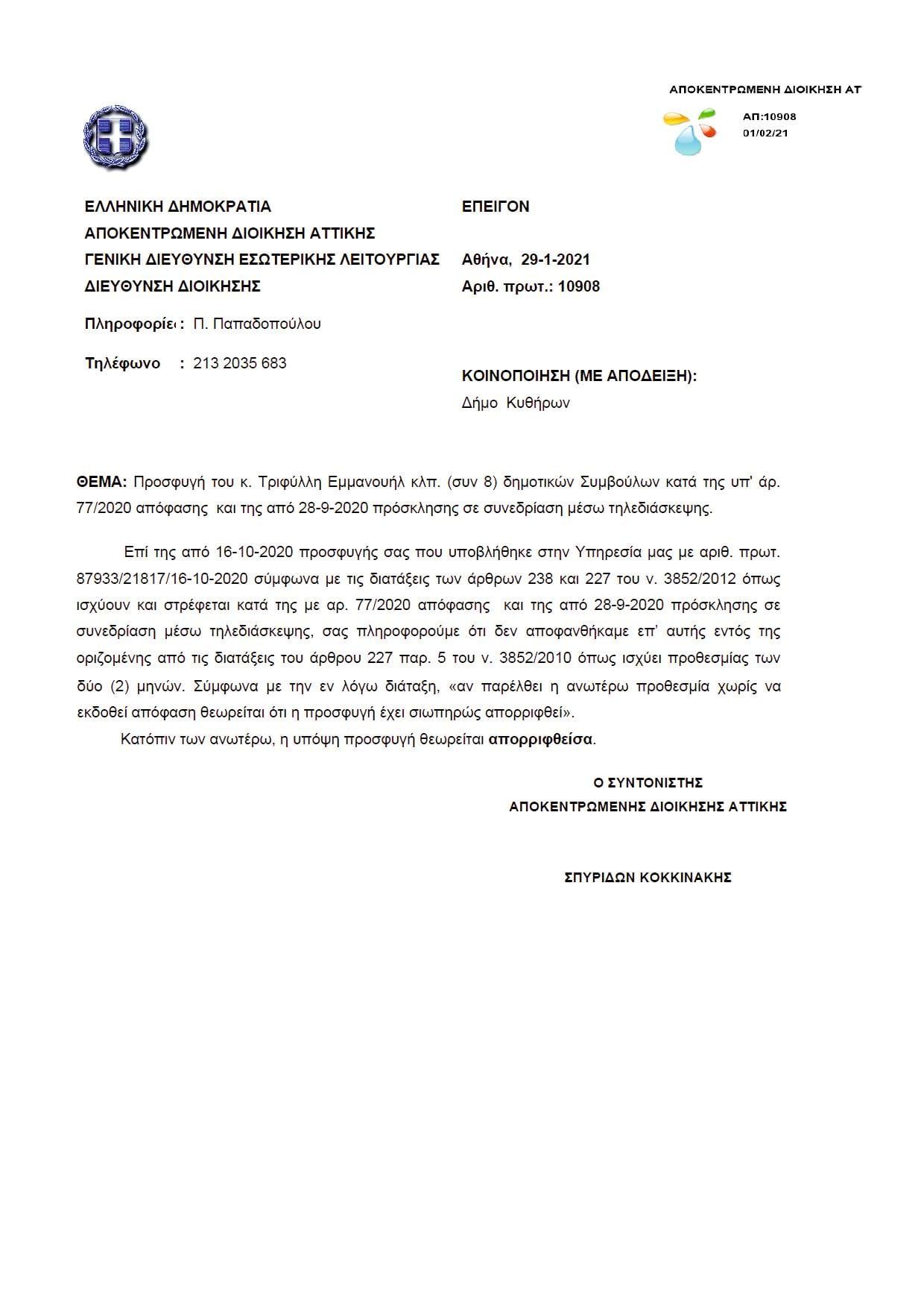 Με απόφαση του Συντονιστή της Αποκεντρωμένης Διοίκησης Αττικής κ. Σπυρίδωνα Κοκκινάκη, ΑΠΟΡΡΙΦΘΗΚΕ η από 16-10-2020 προσφυγή του συνόλου των δημοτικών συμβούλων της Αντιπολίτευσης στο Δήμο Κυθήρων, αναφορικά με τον τρόπο συνεδρίασης των Δημοτικών Συμβουλίων. Συγκεκριμένα, οι 8 δημοτικοί σύμβουλοι της Αντιπολίτευσης ζήτησαν την ακύρωση των αποφάσεων που λήφθηκαν μέσω ανταλλαγής email σε πραγματικό χρόνο, δηλαδή με τηλεδιάσκεψη.