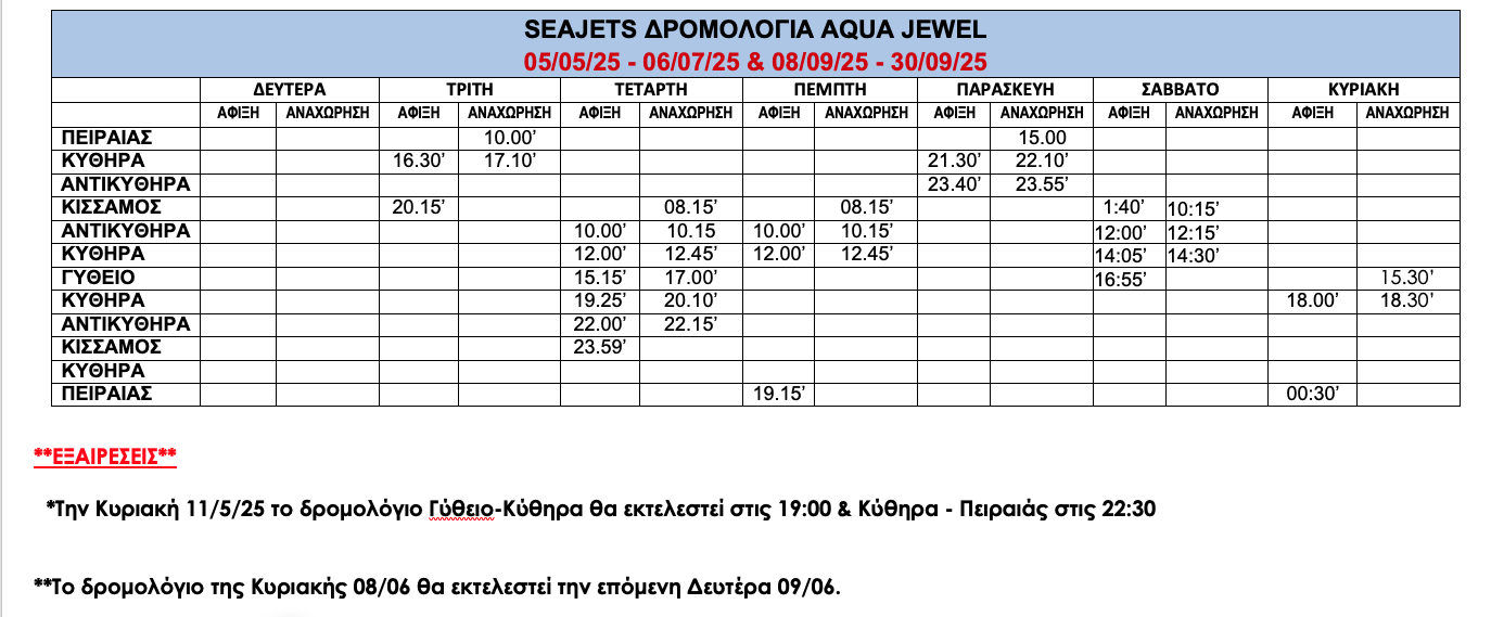 - Την Κυριακή 11/05/2025, το δρομολόγιο Γύθειο – Κύθηρα θα εκτελεστεί στις 19:00 και Κύθηρα – Πειραιά στις 22:30.
