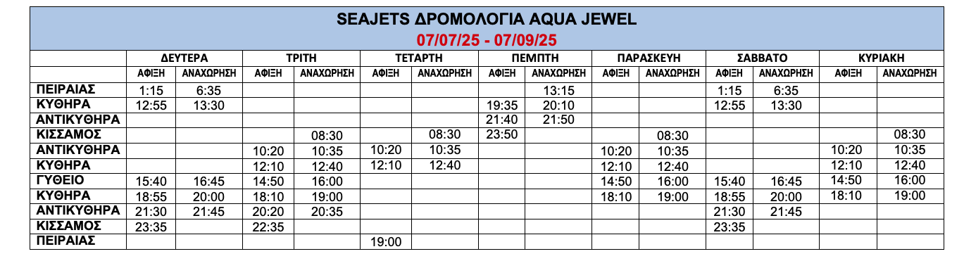 Ανακοινώθηκαν τα θερινά δρομολόγια του πλοίου Aqua Jewel της Seajets, που εξυπηρετεί τις άγονες γραμμές Πειραιά – Κύθηρα – Αντικύθηρα – Κίσσαμο – Γύθειο, καλύπτοντας τη χρονική περίοδο 05 Μαΐου έως 30 Σεπτεμβρίου 2025. Τα δρομολόγια χωρίζονται σε δύο φάσεις: