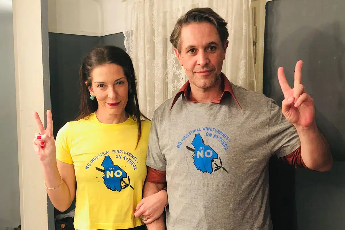 Η Αθηνά Μαξίμου και ο Αιμίλιος Χειλάκης, ηθοποιοί που διατηρούν σπίτι στα Κύθηρα και διαμένουν για αρκετό διάστημα στο νησί, γνωστοί για το πόσο το αγαπάνε, στέλνουν το δικό τους μήνυμα ποζάροντας με το μπλουζάκι – σύμβολο του αγώνα “No industrial windturbines on Kythera!”.