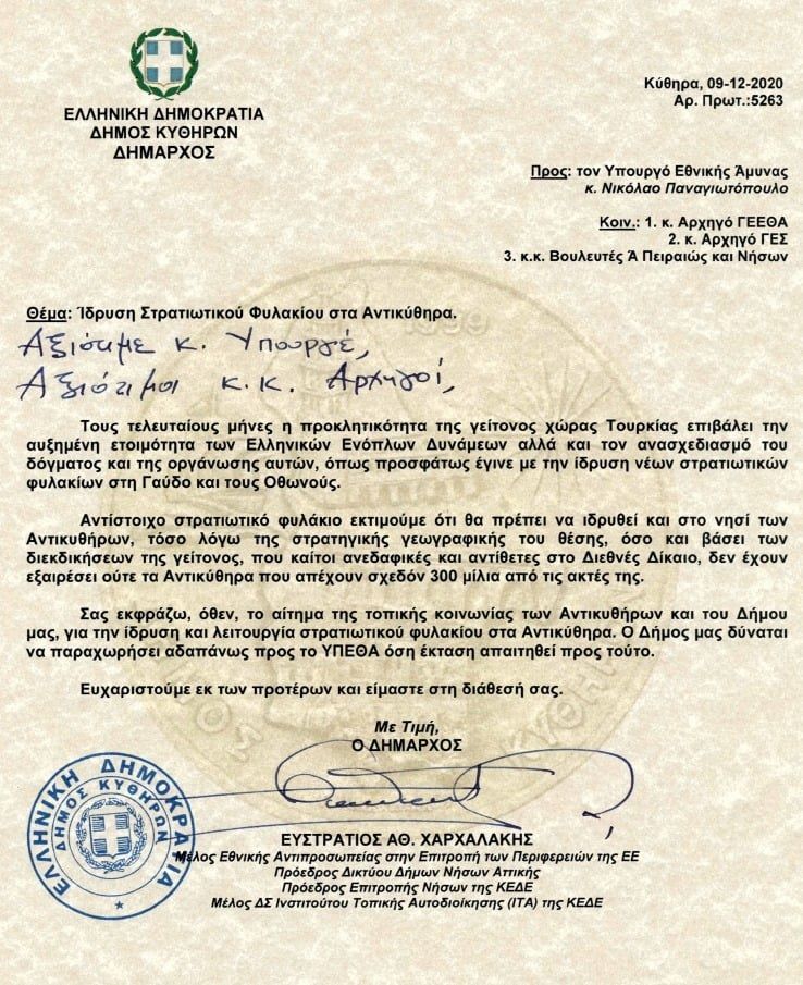 Στην απάντησή του όμως, ο δήμαρχος Κυθήρων επεσήμανε ότι μια μέρα νωρίτερα από το άρθρο της τουρκικής εφημερίδας, είχε ο ίδιος ζητήσει με επιστολή του προς τον υπουργό Εθνικής Άμυνας, τον Αρχηγό ΓΕΕΘΑ, τον Αρχηγό ΓΕΣ, καθώς και στους βουλευτές ‘Α Πειραιώς και Νήσων, την εγκατάσταση στρατιωτικού φυλακίου στο νησί των Αντικυθήρων, στα πρότυπα των αντίστοιχων σε Γαύδο και Οθωνούς.
