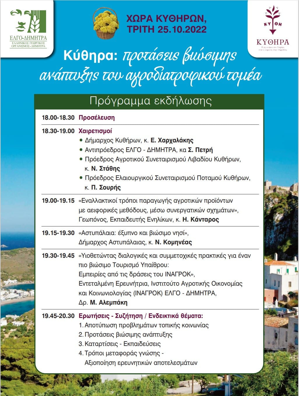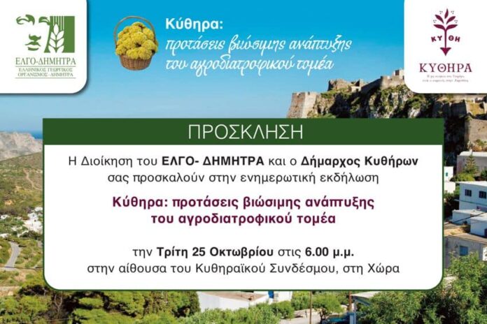 Πρόσκληση απευθύνει η διοίκηση του ΕΛΓΟ – ΔΗΜΗΤΡΑ και ο δήμαρχος Κυθήρων, για συμμετοχή στην ενημερωτική εκδήλωση “Κύθηρα: προτάσεις βιώσιμης ανάπτυξης του αγροδιατροφικού τομέα”.