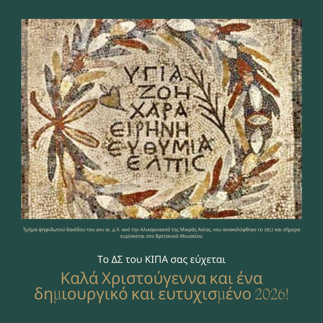 Με ένα ιδιαίτερο και συμβολικό εικαστικό μήνυμα, το Διοικητικό Συμβούλιο του ΚΙΠΑ απευθύνει τις θερμότερες ευχές του προς όλα τα μέλη, τους φίλους και την τοπική κοινωνία για τις Άγιες Ημέρες των Χριστουγέννων και την έλευση του νέου έτους.