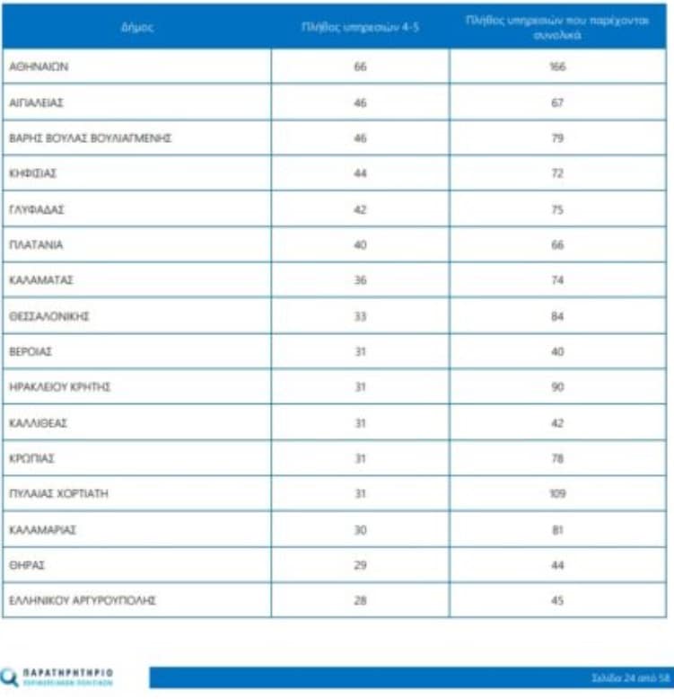 Οι 25 δήμοι της χώρας, που προσφέρουν στους πολίτες τους τις περισσότερες υψηλού επιπέδου υπηρεσίες είναι: