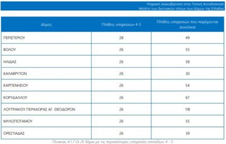 Από το σύνολο (552) των παρεχόμενων υπηρεσιών στους 332 δήμους της χώρας μόνο το 1,2% είναι πλήρως αυτοματοποιημένες. Από αυτές που παρέχονται, οι περισσότερες αφορούν τις κεντρικά παρεχόμενες υπηρεσίες, δηλαδή παρέχονται μέσω του gov.gr, όπως είναι οι υπηρεσίες Δημοτολογίου ή Ληξιαρχείου
