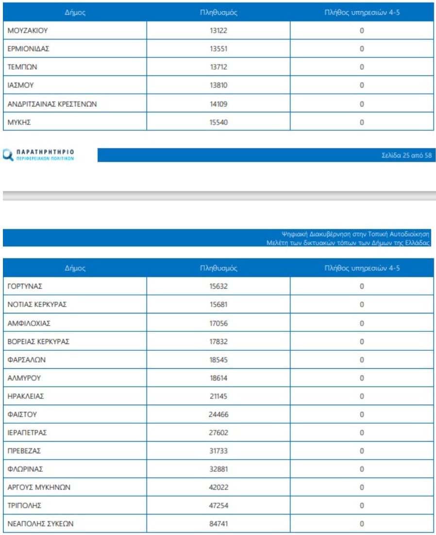 Στον αντίποδα, 20 δήμοι δεν προσφέρουν καμία ολοκληρωμένη υπηρεσία. Έκπληξη αποτελεί παρουσία στη λίστα μεγάλων δήμων της χώρας όπως του Δήμου Νεάπολης-Συκεών, Τρίπολης, Άργους και Φλώρινας: