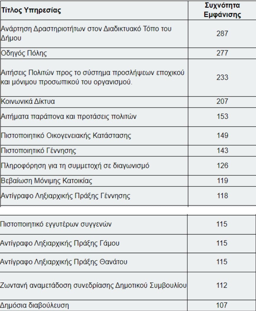 Ανεξαρτήτως της ποιότητας των υπηρεσιών (αν είναι ολοκληρωμένες ή μη) οι 15 υπηρεσίες με την υψηλότερη συχνότητα όπως παρέχονται από τους ιστοτόπους των 332 δήμων της χώρας είναι οι ακόλουθες: