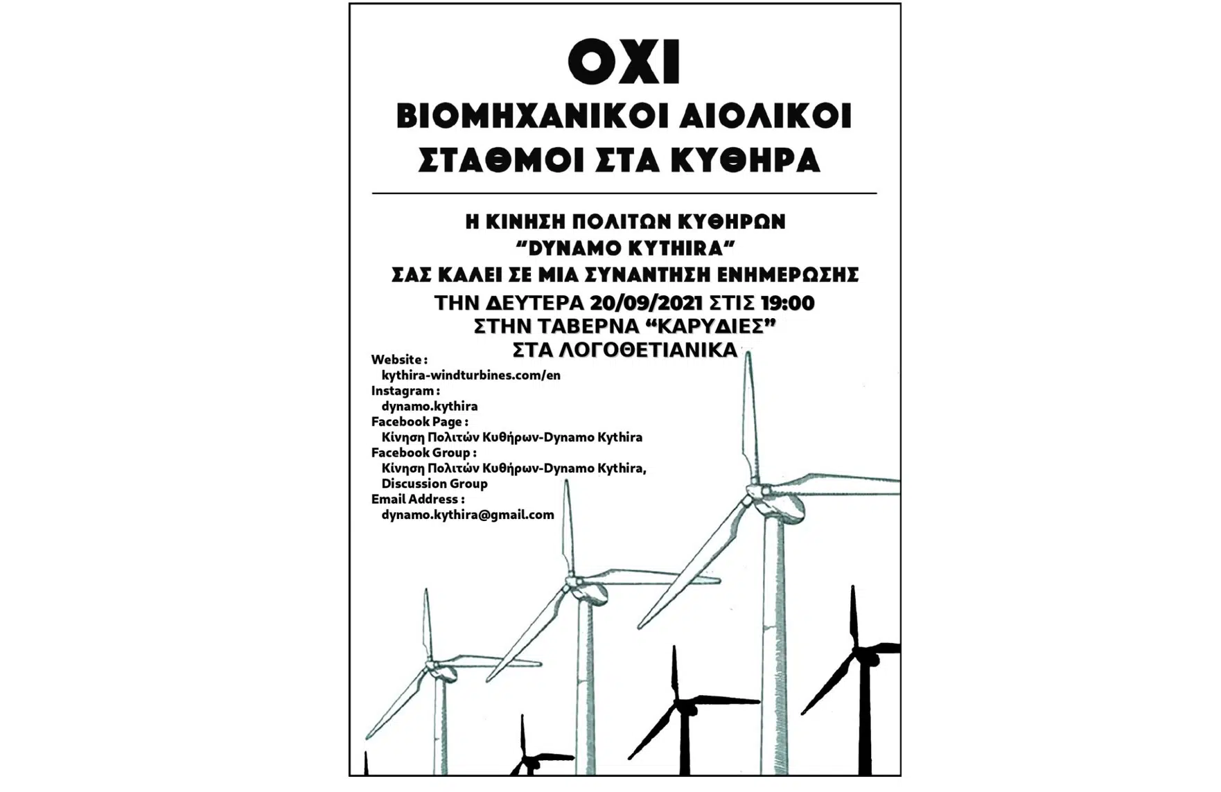 Όχι στην άναρχη τοποθέτηση ανεμογεννητριών στα Κύθηρα, βροντοφωνάζει η «Κίνηση Πολιτών Κυθήρων "Dynamo Kythira"», από τα Λογοθετιάνικα, την Δευτέρα, 20 Σεπτεμβρίου.