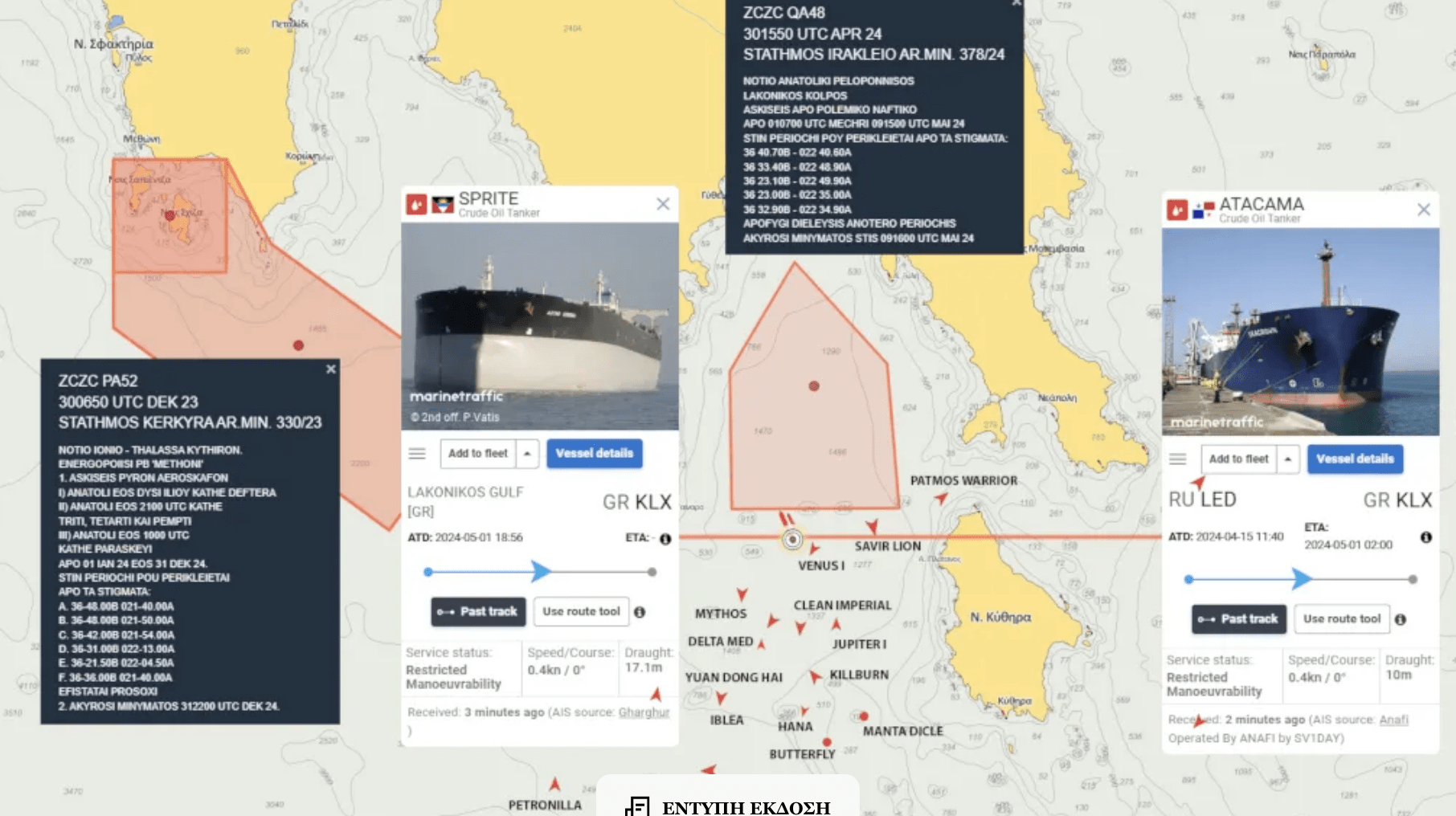 Με εκτενές ρεπορτάζ στην Εφημερίδα των Συντακτών ο δημοσιογράφος Γιάννης Μπαζαίος αναδεικνύει το ζήτημα με τις μεταγγίσεις πετρελαιοειδών ρωσικής προέλευσης μεταξύ τάνκερ, στο Λακωνικό Κόλπο, λίγο έξω από τις δυτικές ακτές των Κυθήρων, μια δραστηριότητα με ακραίο περιβαλλοντικό κίνδυνο για την ευρύτερη περιοχή. Διαβάστε το ρεπορτάζ παρακάτω: