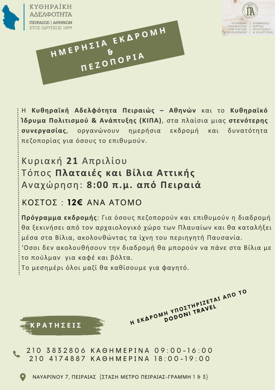 Η Κυθηραϊκή Αδελφότητα Πειραιώς – Αθηνών με το ΚΙΠΑ διοργανώνουν εκδρομή.