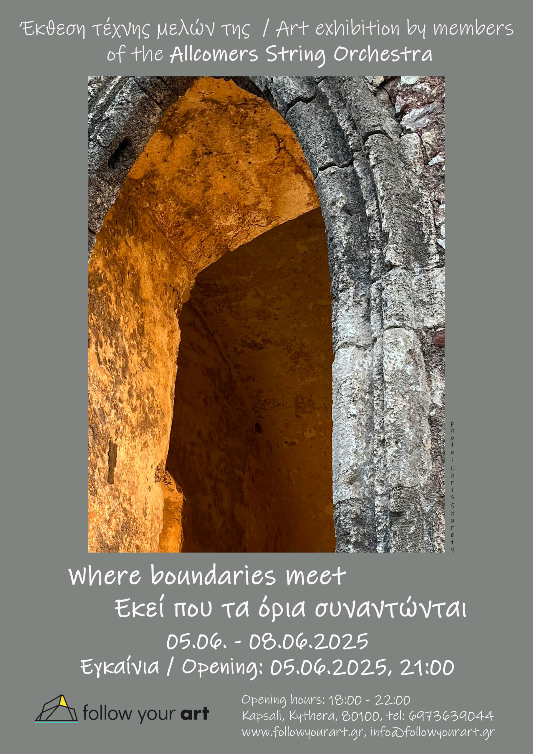 Την Πέμπτη 5 Ιουνίου 2025 στις 21:00, η γκαλερί follow your art σας προσκαλεί στα εγκαίνια της πρώτης καλοκαιρινής έκθεσης με τίτλο «Εκεί που τα όρια συναντώνται». Συμμετέχουν 9 μέλη της ορχήστρας εγχόρδωνAllcomers: Eleanor Eddison, Jill Graham, Adrienne Harris, Liz Herbert, Jan McColl, Sue Morgan, Gwen Ovshinsky, Chris Shurety, Heidi Siegel.