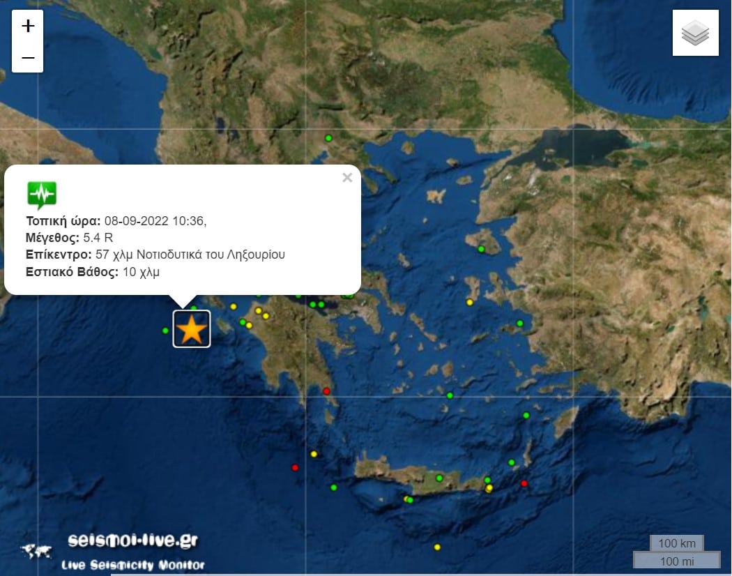 Ισχυρή σεισμική δόνηση σημειώθηκε στις 10:36 το πρωί της Πέμπτης, 08/09, σε θαλάσσιο χώρο ανάμεσα σε Ζάκυνθο και Κεφαλονιά, σύμφωνα με την αναθεωρημένη εκτίμηση του Γεωδυναμικού Ινστιτούτου του Εθνικού Αστεροσκοπείου Αθηνών. Η αρχική εκτίμηση έκανε λόγο για δόνηση της τάξεως των 5,3 βαθμών της κλίμακας Ρίχτερ.