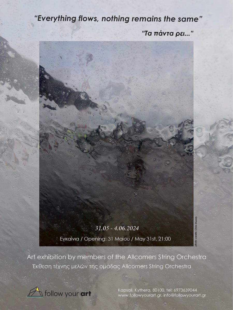 Την Παρασκευή 31 Μαΐου 2024 η γκαλερί «follow your art» σας προσκαλεί στην πρώτη έκθεση της καλοκαιρινής σεζόν, με τίτλο «Τα πάντα ρει». Στην έκθεση παρουσιάζονται εικαστικά έργα 9 μελών της ορχήστρας Allcomers String Orchestra.
