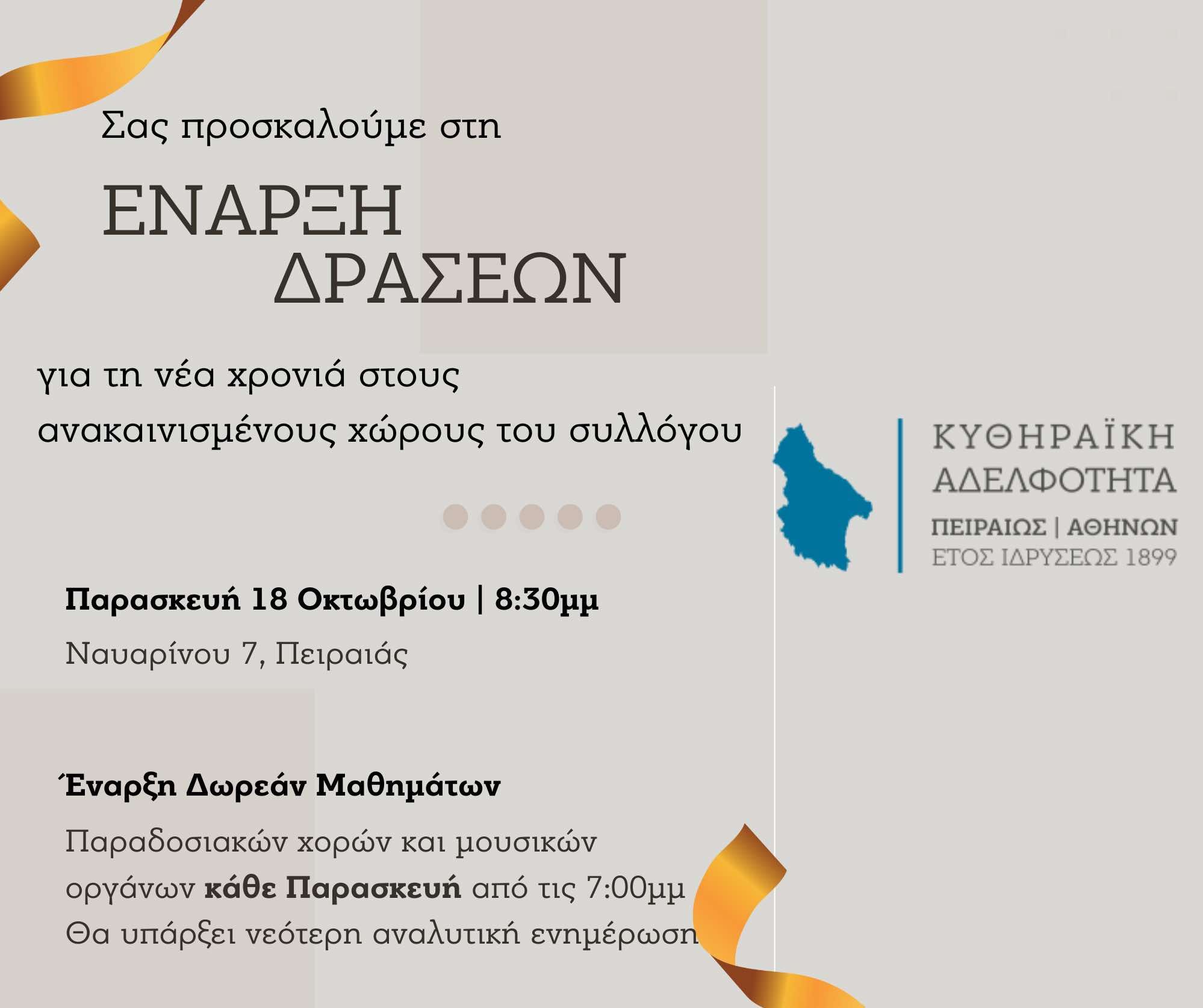 Οι πρώτοι Κυθήριοι που ήρθαμε στον Άλιμο ονειρευτήκαμε την λειτουργία ενός Πνευματικού Κέντρου των Κυθήρων στην Αττική για την προβολή των εθίμων και των παραδόσεών μας, την ανάδειξη του νησιού μας, την παροχή κοινωφελών υπηρεσιών στους συντοπίτες μας και την διαφύλαξη του βιοτικού επιπέδου στο νέο μας τόπο, όπου εγκατασταθήκαμε και στεριώσαμε.