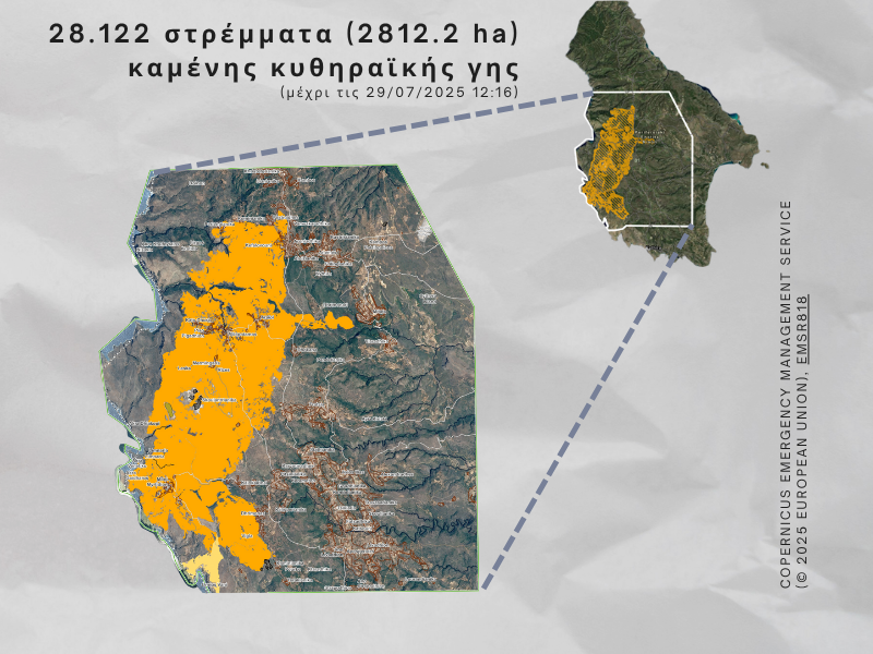Ο εφιάλτης της μεγάλης πυρκαγιάς του 2017 ξαναχτύπησε τα Κύθηρα μόλις οκτώ καλοκαίρια μετά. Πάνω από 28.000 στρέμματα κυθηραϊκής γης κάηκαν, με διαρκείς αναζωπυρώσεις μέχρι και πρόσφατα (30 Ιουλίου) που ισοδυναμούν με περισσότερο από το 10% της έκτασης του νησιού. Σημαντικό μέρος της πληγείσας περιοχής ταυτίζεται με τις καμένες εκτάσεις του 2017 με αποτέλεσμα να αποδυναμωθεί η φυσική αναγέννηση και να υποβαθμιστούν οι εδαφικοί πόροι, εντείνοντας τη διάβρωση και τον κίνδυνο πλημμυρικών φαινομένων. Στο βαθμό που επηρεάζεται και τμήμα του κεδροδάσους, το οποίο δεν αναγεννάται φυσικά μετά από πυρκαγιές, θα έχουμε επιπλέον μία σημαντική απώλεια για το φυσικό περιβάλλον του νησιού.