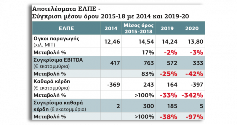 ■ Καταφέρνεις να «γυρίσεις» την ΕΛΠΕ σε αντίστροφη πορεία (βλ. πίνακα παραπάνω). Το 2020 ο Ομιλος (και λόγω της πανδημίας – αλλά χειρότερα σχεδόν από όλες τις εταιρείες του κλάδου) κατέγραψε ζημιές 397 εκατ. ευρώ, με πτώση παραγωγής, αλλά χωρίς να «βλάψει» τους μετόχους (όπως την Paneuropean του κ. Λάτση) οι οποίοι έλαβαν κανονικά το μέρισμά τους, ακόμα και αν η επιχείρηση χρειάστηκε να δανειστεί. Το πρώτο εξάμηνο του 2021 επίσης παρουσίασε ζημιές…