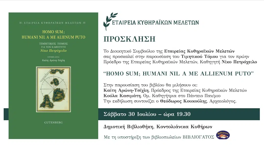 Το Διοικητικό Συμβούλιο της Εταιρείας Κυθηραϊκών Μελετών σας προσκαλεί στην παρουσίαση του Τιμητικού Τόμου για τον πρώην Πρόεδρο της Εταιρείας Κυθηραϊκών Μελετών, Καθηγητή Νίκο Πετρόχειλο.