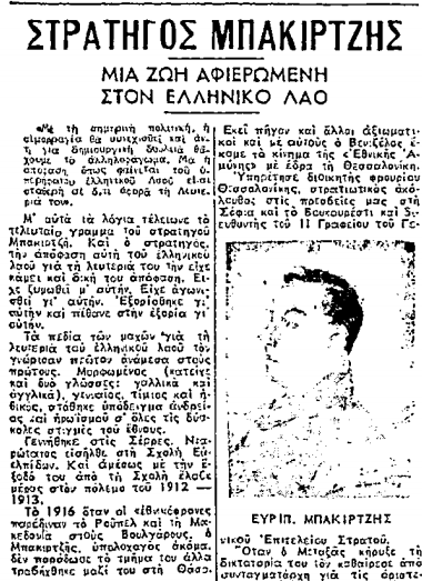 «Σήμερον Παρασκευήν δευτέραν πρωινήν ευρέθη νεκρός με τραύμα εις την καρδίαν εντός δωματίου του εις Φούρνους Ικαρίας ο στρατηγός Μπακιρτζής. Αι συνθήκαι υπό τας οποίας επήλθεν ο θάνατος είναι ύποπτοι. Ο διοικητής της Χωροφυλακής Ικαρίας ηρνήθη να επιτρέψη εις τον ιατρόν των εξορίστων και εις επιτροπήν αυτών όπως μεταβούν επί τόπου προς διαπίστωσιν των συνθηκών υπό τας οποίας επήλθεν ο θάνατος . Εζητήσαμεν την μεταφοράν του νεκρού εις Αθήνας και την άφιξιν του Εισαγγελέως Σάμου προς διενέργειαν ανακρίσεων.