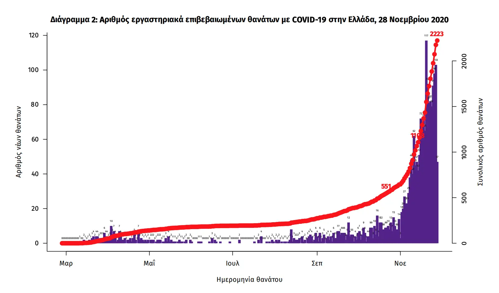 Τέλος, έχουμε 121 ακόμα καταγεγραμμένους θανάτους και 2.223 θανάτους συνολικά στη χώρα, 891 (40,1%) γυναίκες και οι υπόλοιποι άνδρες. Η διάμεση ηλικία των θανόντων συμπολιτών μας ήταν τα 80 έτη και το 96,8% είχε κάποιο υποκείμενο νόσημα ή/και ηλικία 70 ετών και άνω.