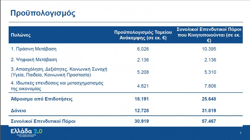 Το Εθνικό Σχέδιο Ανάκαμψης και Ανθεκτικότητας είναι ένας πολύ καλά μελετημένος οδικός χάρτης με 170 έργα, επενδύσεις και μεταρρυθμίσεις. Στηρίζεται σε 4 πυλώνες, την ψηφιακή μετάβαση του Κράτους και της Οικονομίας, την αύξηση της απασχόλησης και της κοινωνικής συνοχής, την πράσινη Οικονομία, και την εκτίναξη της παραγωγικής δραστηριότητας.