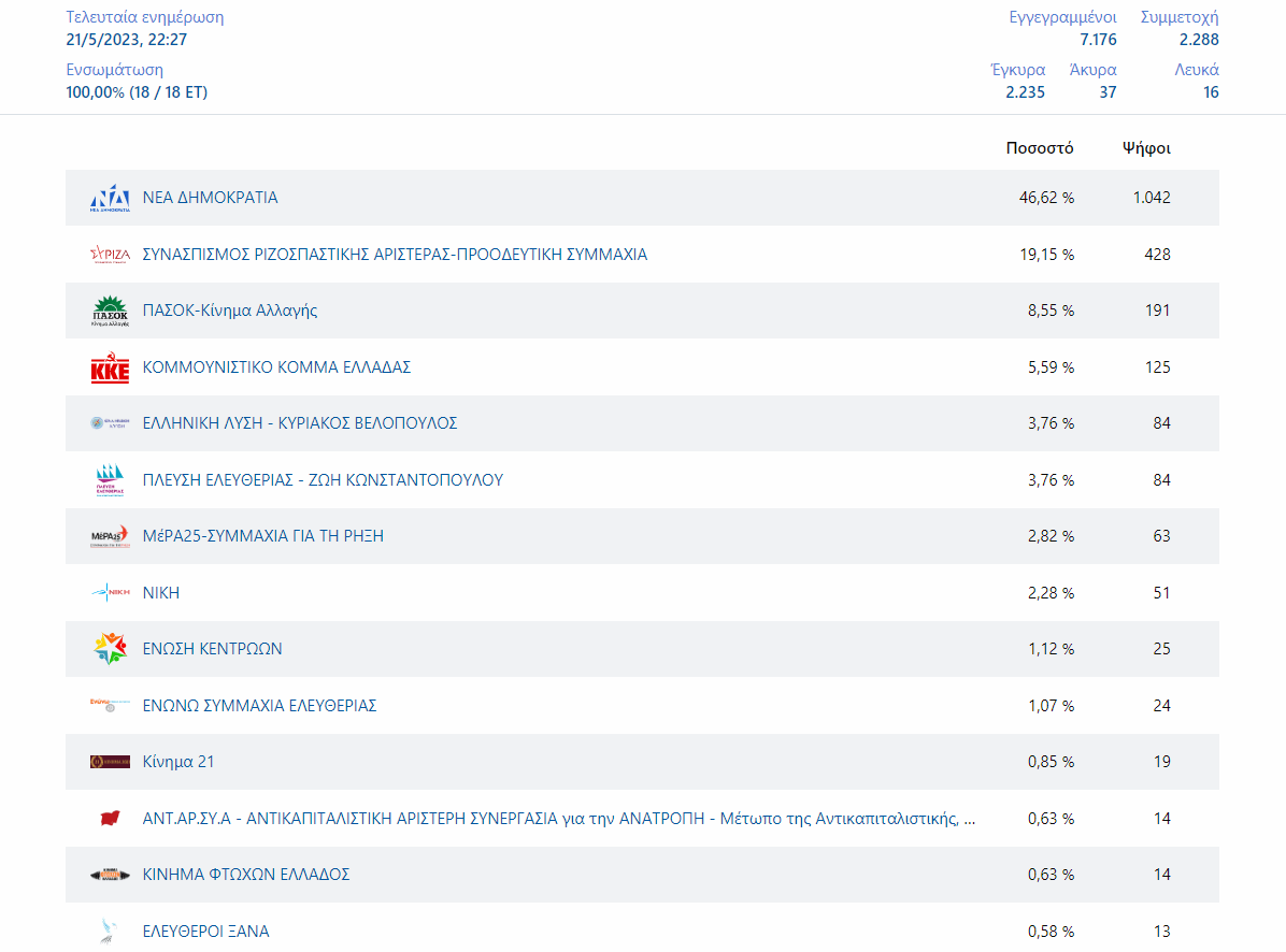 Κύθηρα – Εθνικές Εκλογές: Συγκεντρωτικά σε 18 από 18 Ε.Τ (ΤΕΛΙΚΑ)
