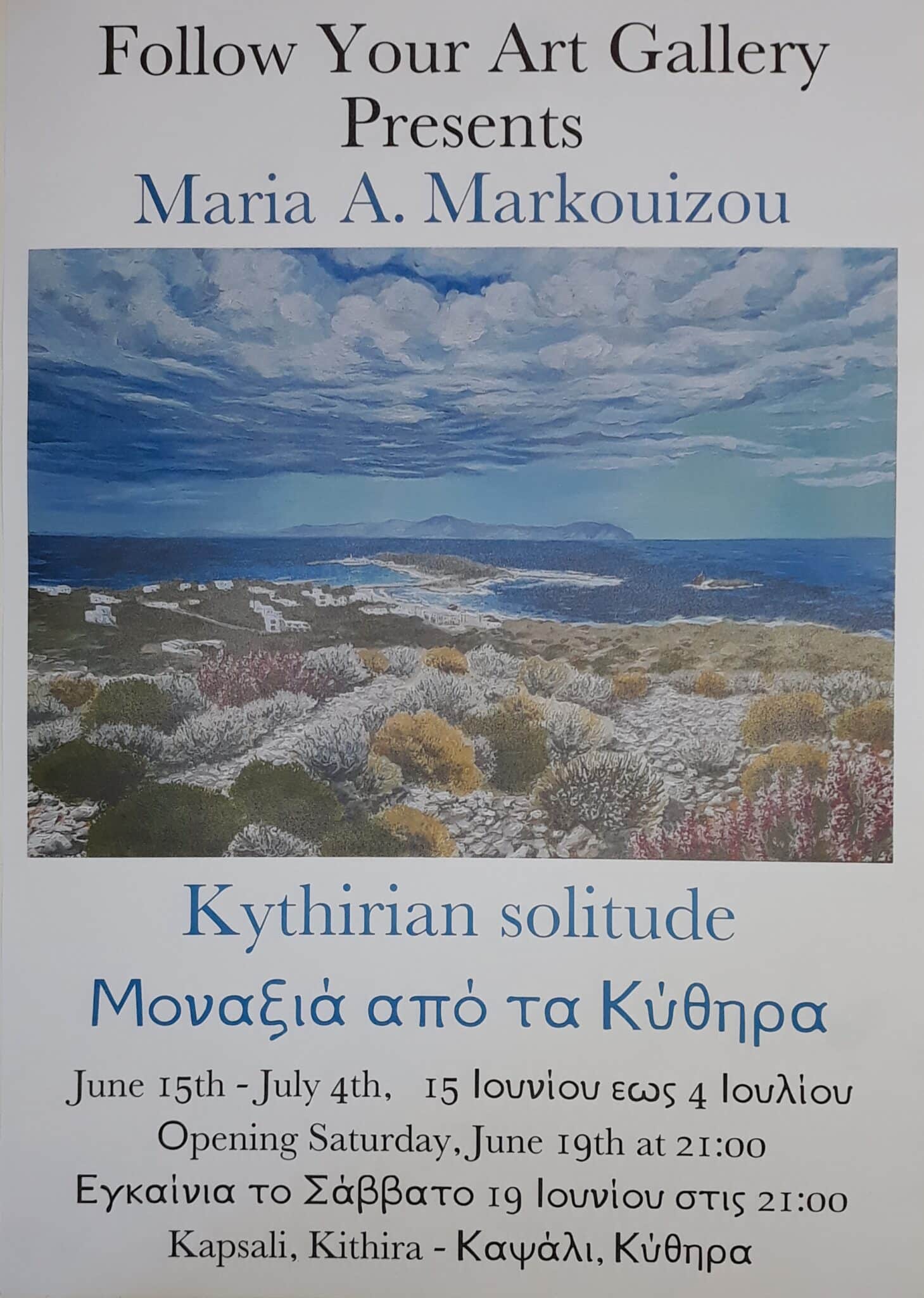 Έκθεση με έργα ζωγραφικής της Μαρίας Μαρκουίζου, θα φιλοξενήσει η Follow Your Art Gallery στο Καψάλι, από 15/06/21 έως 04/07/21. Η έκθεση φέρει τίτλο «Μοναξιά από τα Κύθηρα» (Kythirian Solitude) και στις δημιουργίες περιλαμβάνονται ακρυλικά σε ξύλο και καμβά καθώς και ακουαρέλες.