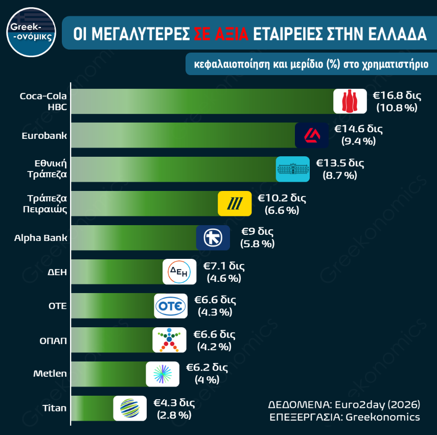 Σήμερα, στην κορυφή της κεφαλαιοποίησης της ελληνικής αγοράς βρίσκεται η Coca-Cola HBC [2], ένας «βαρύς» πολυεθνικός όμιλος με έντονο διεθνές αποτύπωμα, που προσφέρει μεγαλύτερη σταθερότητα στο ελληνικό χρηματιστήριο.
