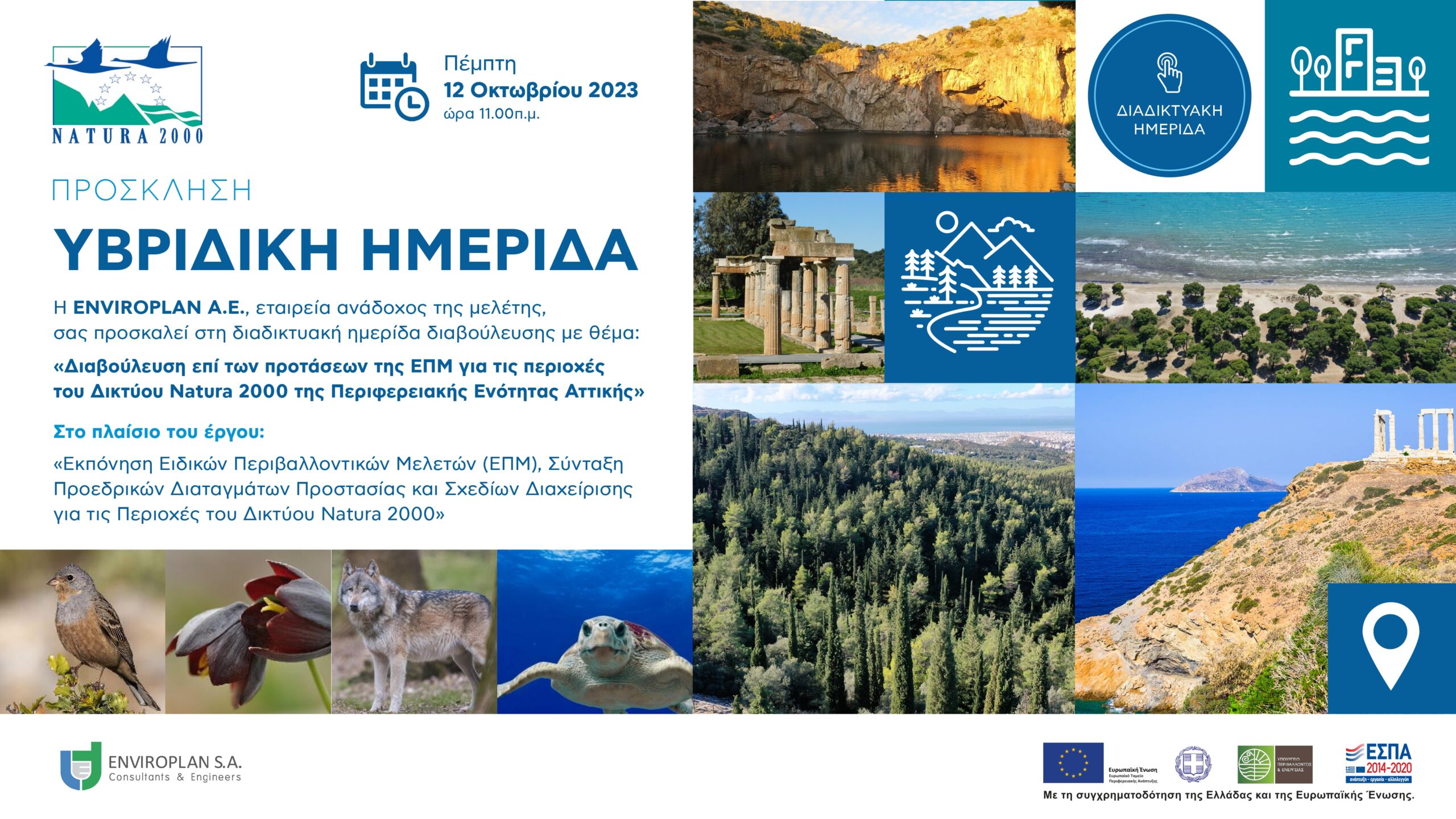 Στο πλαίσιο του έργου «Εκπόνηση Ειδικών Περιβαλλοντικών Μελετών (ΕΠΜ), Σύνταξη Προεδρικών ∆ιαταγµάτων Προστασίας και Σχεδίων ∆ιαχείρισης για τις Περιοχές του ∆ικτύου Natura 2000» του Υπουργείου Περιβάλλοντος και Ενέργειας, διοργανώνεται την Πέμπτη 12 Οκτωβρίου στις 11:00 π.μ. υβριδική ημερίδα µε θέμα: