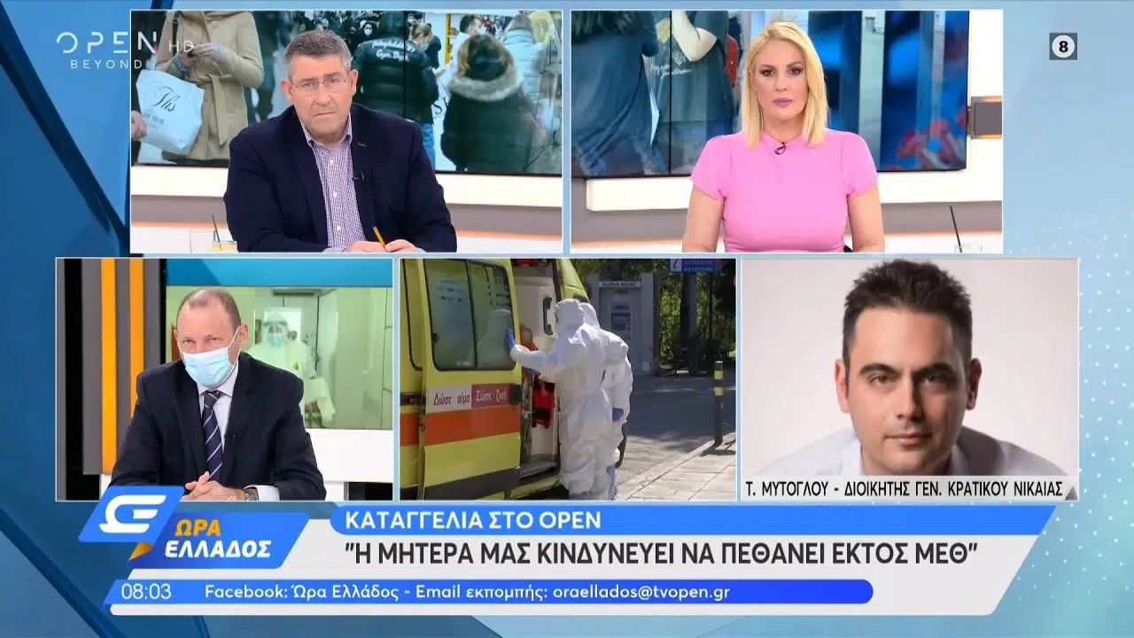Επικοινωνία με τον τηλεοπτικό σταθμό OPEN και την πρωινή εκπομπή της Παρασκευής, 02/04, “Ώρα Ελλάδος”, είχε ο διοικητής του Γενικού Κρατικού Νικαίας, Τ. Μύτογλου. Η παρέμβαση του κου Μύτογλου είχε να κάνει με την καταγγελία λίγο νωρίτερα στην ίδια εκπομπή, από 4 αδέλφια, ότι η μητέρα τους, η οποία νοσηλεύεται με βαριά συμπτώματα του κορονοϊού στο εν λόγω νοσοκομείο, από τις 23 Μαρτίου, εξακολουθεί να παραμένει εκτός ΜΕΘ, και μάλιστα με επιλογή ασθενών προς διακόμιση από τους αρμοδίους.
