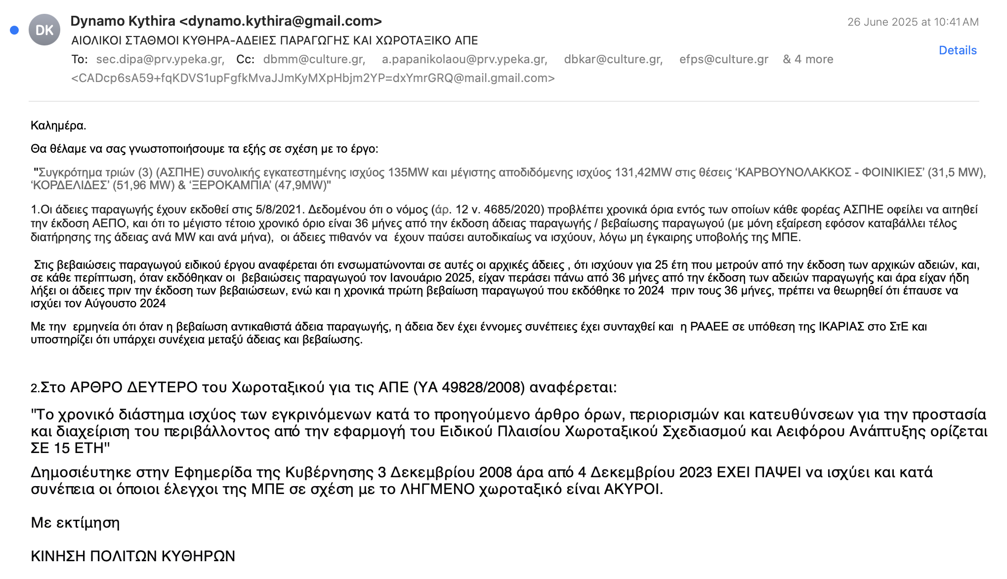 «Η ειδική περιβαλλοντική μελέτη που εκπονήθηκε για την περιοχή Natura 2000 των Κυθήρων απαγορεύει ρητά την τοποθέτηση ανεμογεννητριών. Κι όμως, η κυβέρνηση δεν την έχει ακόμα εγκρίνει, δίνοντας έτσι παράθυρο στην εταιρεία να καταθέσει ΜΠΕ».