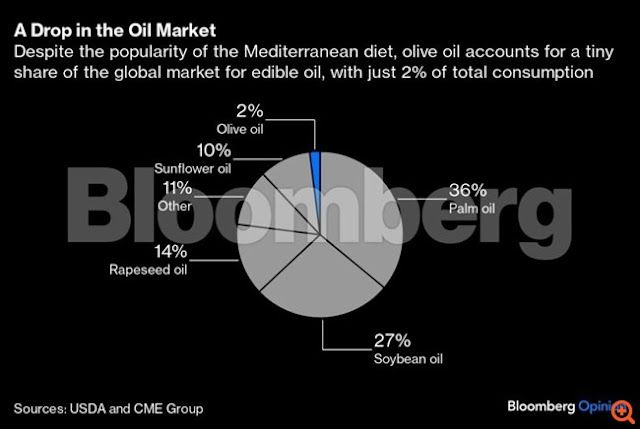 Για τον υπόλοιπο κόσμο, ωστόσο, το σοκ είναι πολύ μικρότερο. Παρότι ιδιαίτερα δημοφιλές στη Νότια Ευρώπη, το ελαιόλαδο αντιπροσωπεύει μόνο ένα μικρό κλάσμα της ποσότητας βρώσιμων ελαίων που καταναλώνεται παγκοσμίως. Το 2020, αντιστοιχούσε σε λιγότερο από το 2% της παγκόσμιας αγοράς, ποσοστό ανάλογου αυτών του βαμβακέλαιου και του λαδιού από καρύδα. Το φοινικέλαιο και το σογιέλαιο αντιπροσωπεύουν συνολικά το 65% της αγοράς, ενώ το ηλιέλαιο και το κραμβέλαιο ποσοστό 24%.
