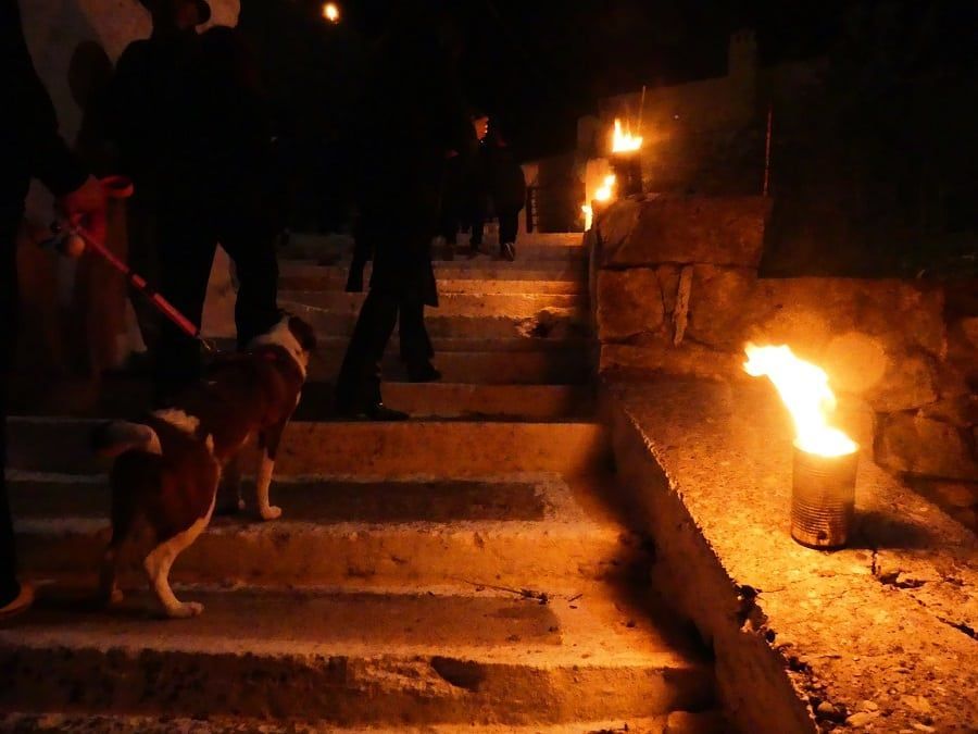 Η Περιφορά προχωρά και φτάνει μέχρι την είσοδο του ενετικού κάστρου. Οι πιστοί τοποθετούν μικρά τσίγκινα τενεκεδάκια σαν αυτοσχέδια καντήλια σε όλους τους βράχους του κόλπου μέχρι το φάρο και πάνω στο κάστρο, και τα ανάβουν μόλις περνάει ο Επιτάφιος.