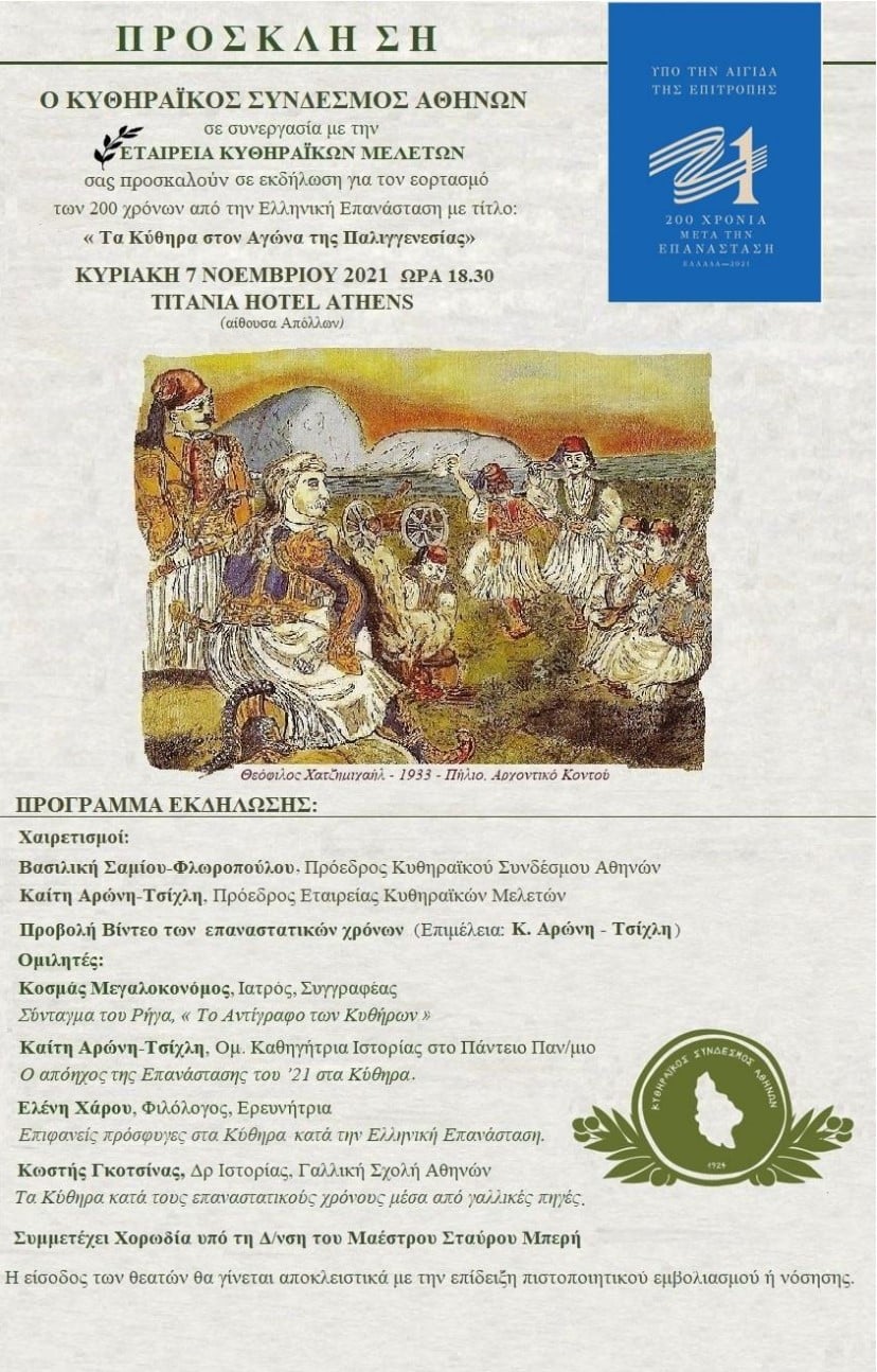 Ο Κυθηραϊκός Σύνδεσμος Αθηνών, σε συνεργασία με την Εταιρεία Κυθηραϊκών Μελετών, απευθύνει πρόσκληση σε εκδήλωση για τον εορτασμό των 200 χρόνων από την Ελληνική Επανάσταση, με τίτλο: «Τα Κύθηρα στον Αγώνα της Παλιγγενεσίας».
