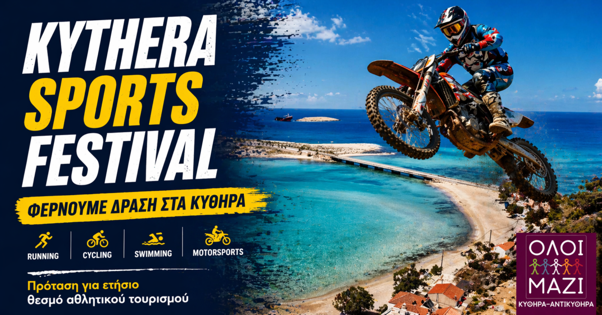 Μία φιλόδοξη πρόταση για την καθιέρωση ενός ετήσιου, εβδομαδιαίου αθλητικού φεστιβάλ στα Κύθηρα κατέθεσε προς τη Δημοτική Αρχή η παράταξη «Όλοι Μαζί, Κύθηρα – Αντικύθηρα». Με κεντρικό σκεπτικό ότι «τα Κύθηρα έχουν δυνατότητες, αλλά λείπουν οι στοχευμένες δράσεις», η παράταξη στοχεύει στην ανάπτυξη του αθλητικού τουρισμού ως εργαλείο προσέλκυσης επισκεπτών εκτός της υψηλής τουριστικής περιόδου.