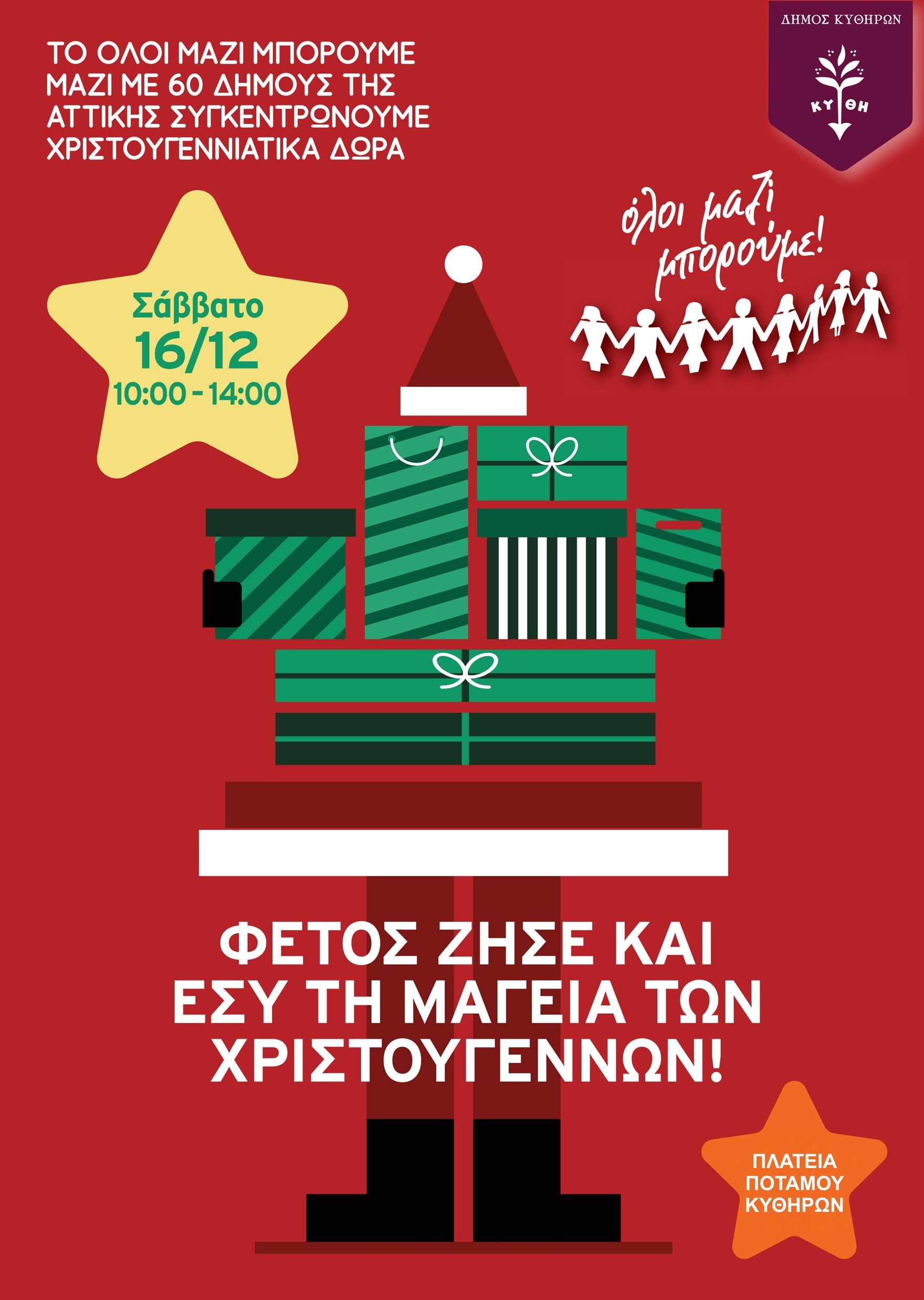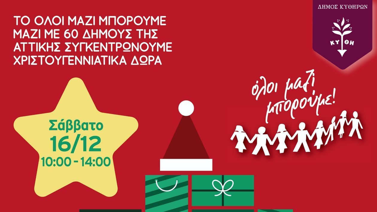 Το ΟΛΟΙ ΜΑΖΙ ΜΠΟΡΟΥΜΕ, σε συνεργασία με 60 Δήμους της Αττικής, διοργανώνει δράσεις συγκέντρωσης χριστουγεννιάτικων δώρων, ώστε να μην αφήσει κανένα παιδί χωρίς το δώρο του.