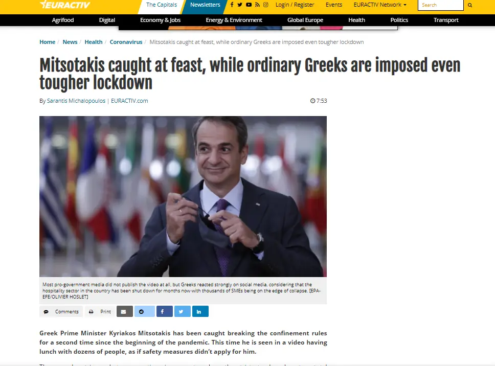 Euractiv: «Ο Μητσοτάκης συλλαμβάνετα σε γλέντι, ενώ στους Έλληνες πολίτες επιβάλλεται ακόμα πιο σκληρό lockdown»
