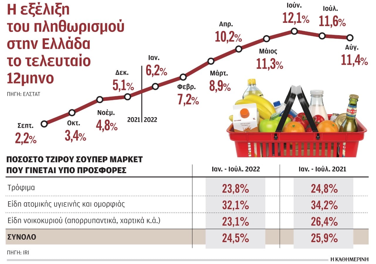 Σύμφωνα με στελέχη του κλάδου των σούπερ μάρκετ, οι νέοι τιμοκατάλογοι που έχουν φθάσει από προμηθευτές περιλαμβάνουν τις ακόλουθες ανατιμήσεις: 16% στους φρέσκους χυμούς, 15% στα ψάρια, 13% στα τυριά, 6%-12% στα μπισκότα, 12% στα χαρτικά, έως 12% στις σοκολάτες, 9% στα ζυμαρικά, 8% στο γιαούρτι, 6% στα αλλαντικά, 5% στο φρέσκο γάλα, 5% στο ελαιόλαδο, 6% στα όσπρια, 9% στα είδη προσωπικής υγιεινής. Υπενθυμίζεται ότι τον Αύγουστο του 2022, σύμφωνα με τα στοιχεία της ΕΛΣΤΑΤ, η ομάδα «Διατροφή και μη αλκοολούχα ποτά» κατέγραψε ετήσια αύξηση τιμών 13,2%, από 1,3% σε μηνιαία βάση. Σε επίπεδο Ευρωζώνης οι τιμές των τροφίμων σε ετήσια βάση αυξήθηκαν κατά 10,6%, από 9,8% τον Ιούλιο. Αντιστοίχως, στις ΗΠΑ παρά την υποχώρηση του δείκτη τιμών καταναλωτή τον Αύγουστο, κυρίως λόγω της μείωσης της τιμής της βενζίνης, ο πληθωρισμός των τροφίμων έφθασε στο 11,4%.