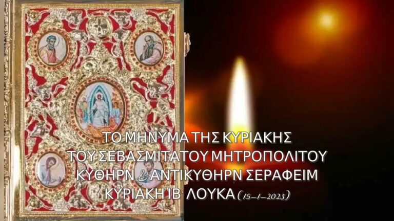 ΤΟ ΜΗΝΥΜΑ ΤΗΣ ΚΥΡΙΑΚΗΣ (ἠχητικό μήνυμα)ΣΕΒΑΣΜΙΩΤΑΤΟΥ ΜΗΤΡΟΠΟΛΙΤΟΥ ΚΥΘΗΡΩΝ & ΑΝΤΙΚΥΘΗΡΩΝ ΣΕΡΑΦΕΙΜΚΥΡΙΑΚΗ ΙΒ' ΛΟΥΚΑ