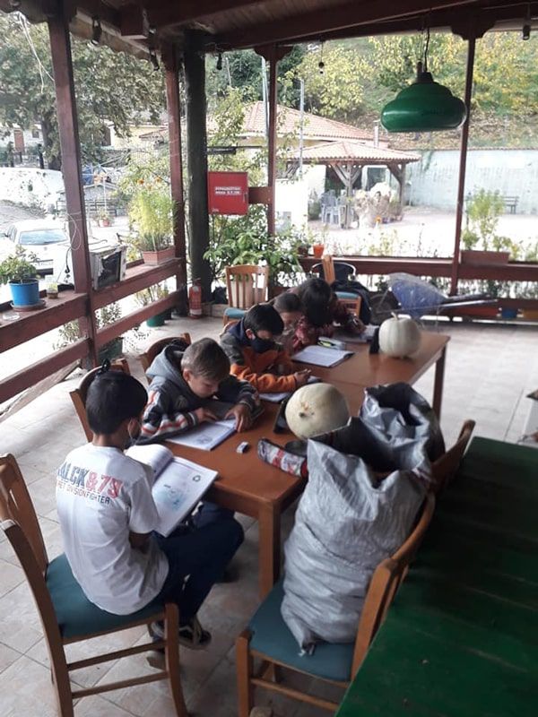 Εκεί, έχει διαμορφώσει έναν χώρο έξω από το κατάστημα, όπου τα παιδιά μαζεύονται μέσα στο κρύο και προσπαθούν να κάνουν μάθημα. Και λέμε προσπαθούν, μιας και το μοναδικό laptop που διέθετε ο κύριος Ξουλεής και τα 2-3 κινητά που στηρίζουν πάνω σε κολοκύθες, δεν αρκούν για να καλυφθεί η ανάγκη. Αλλά και να συνέβαινε αυτό, η εικόνα 5 παιδιών να πασχίζουν να ζεσταθούν και παράλληλα να μορφωθούν δίχως τα στοιχειώδη, δεν τιμά κανέναν.
