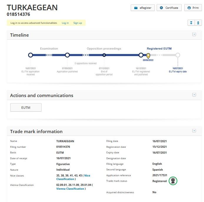 Συγκεκριμένα, σύμφωνα με στοιχεία που είναι καταχωρημένα στο Γραφείο Διανοητικής Ιδιοκτησίας της ΕΕ (EUTM), στις 16 Ιουλίου, η τουρκική πλευρά κατέθεσε αίτηση στην ΕΕ για την κατοχύρωση του εμπορικού σήματος «Turkaegean». Στις 7 Σεπτεμβρίου η αίτηση δημοσιεύτηκε. Η ελληνική πλευρά μπορούσε να καταθέσει αίτηση ανακοπής σε βάρος της τουρκικής αίτησης εντός τριμήνου.