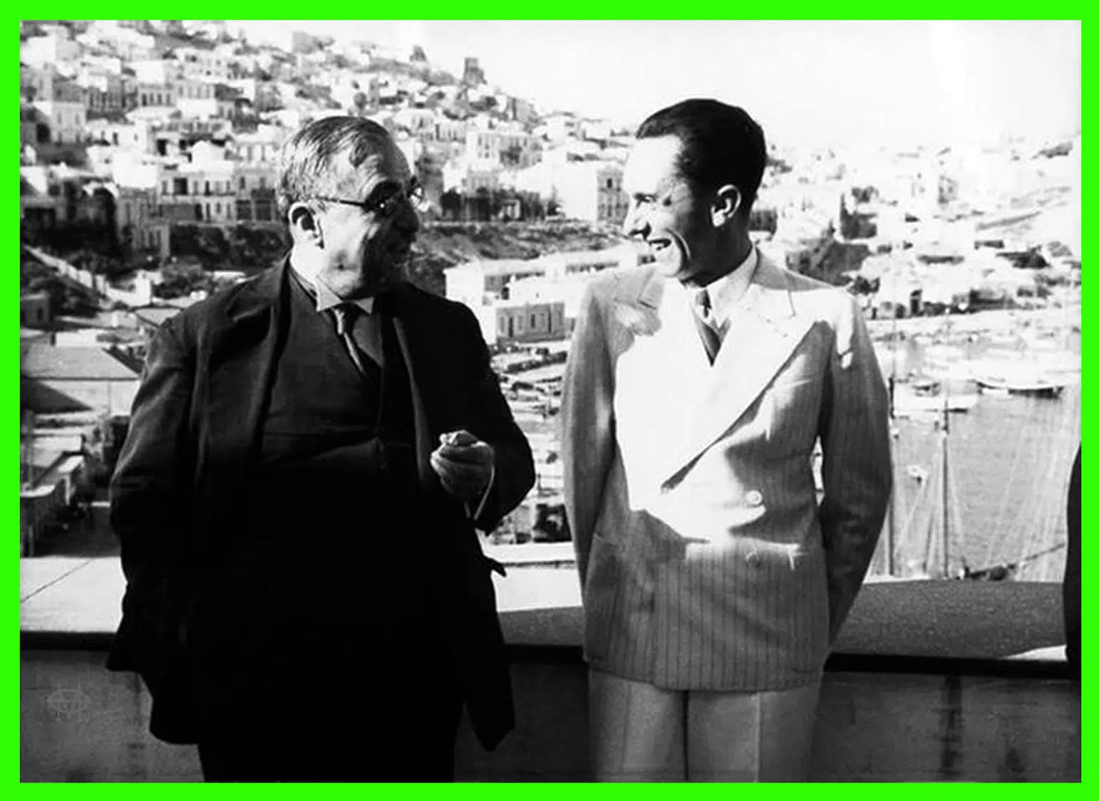 στη φωτογραφία βλέπουμε το Γιόζεφ Γκέμπελς στη βεράντα του ναυτικού ομίλου με τον δικτάτορα Μεταξά και φόντο το Μικρολίμανο και την Καστέλλα
